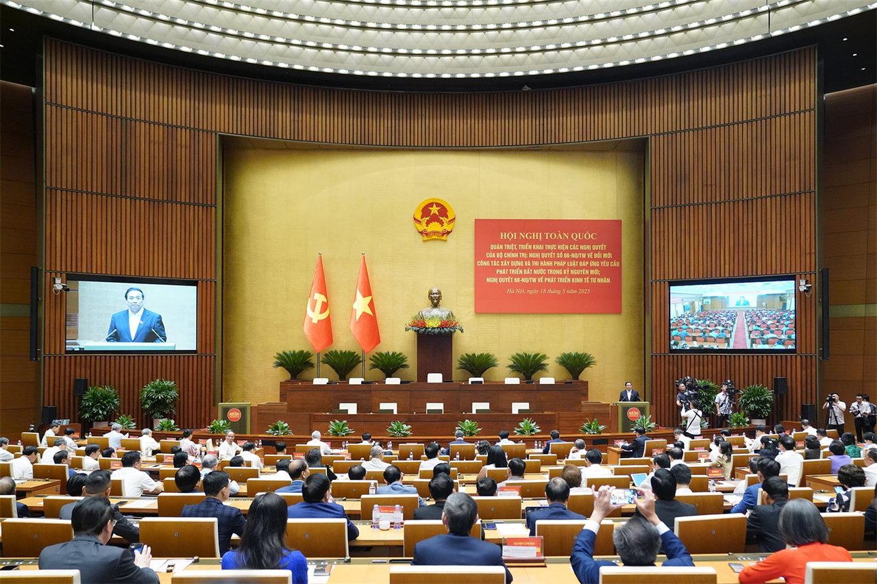 Ngày 18/5/2025, Bộ Chính trị tổ chức Hội nghị toàn quốc quán triệt và triển khai thực hiện Nghị quyết số 66-NQ/TW ngày 30/4/2025 về đổi mới công tác xây dựng và thi hành pháp luật đáp ứng yêu cầu phát triển đất nước trong kỷ nguyên mới. Ảnh: Quochoi.vn