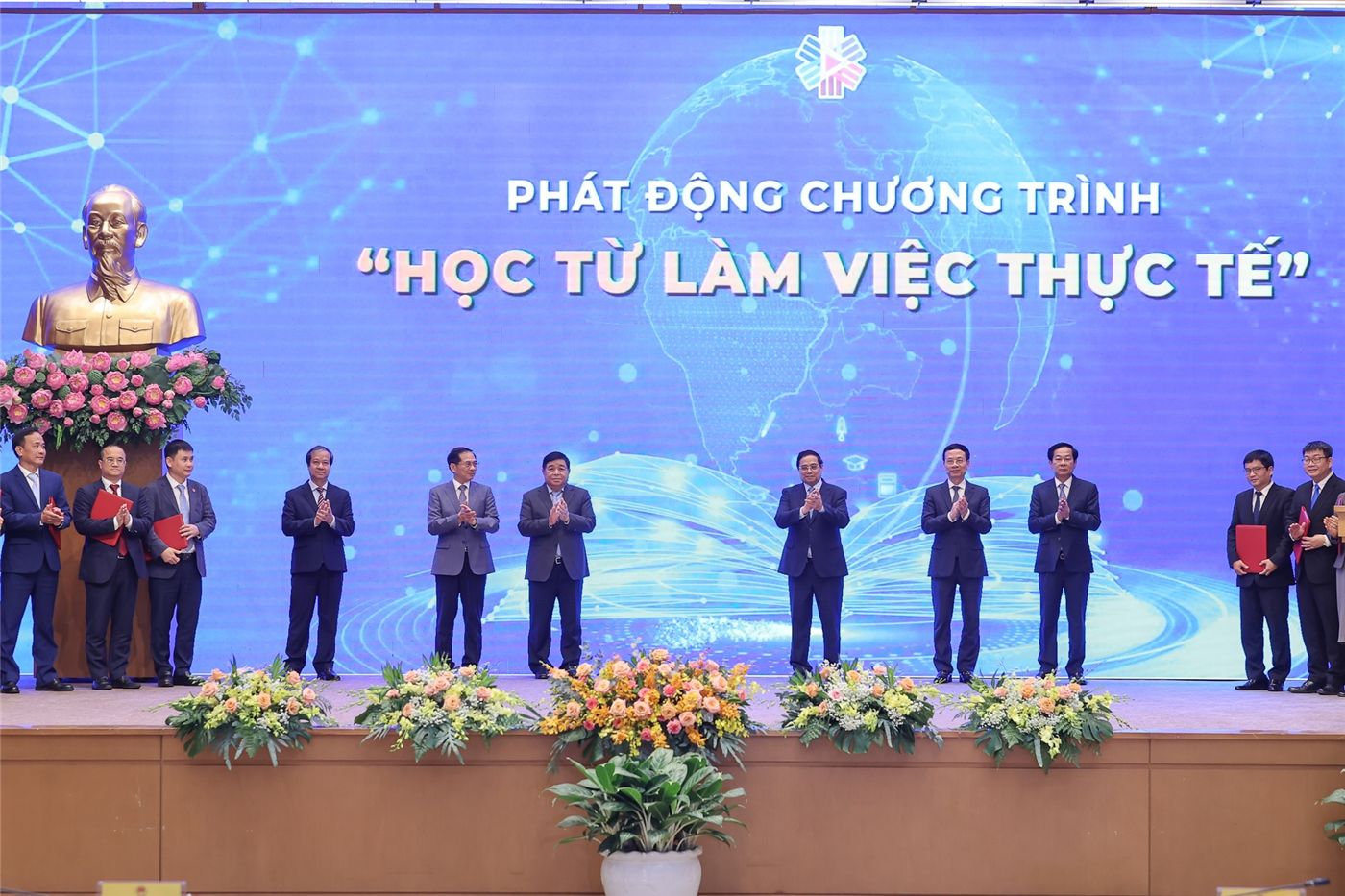 Thủ tướng và các đại biểu cùng thực hiện nghi thức phát động chương trình "Học từ việc làm thực tế" - Ảnh: VGP/Nhật Bắc