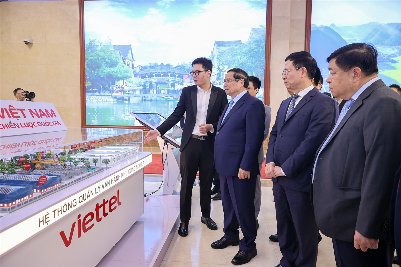 Thủ tướng thăm gian triển lãm của Tập đoàn CT Group, nghe giới thiệu về Bản sao số quốc gia do đơn vị thành viên CT Group là Công ty National Digital Twin 15 (NDT 15) tiên phong phát triển toàn diện, với hơn 300 lớp dữ liệu đầu vào, kể cả đầu vào các bản sao số ngành, khu vực… thống nhất thành 1 bản sao số duy nhất bằng công nghệ AI, phản ánh toàn bộ không gian và con người vật lý thành không gian số, có khả năng ứng dụng rất hiệu quả trong quản lý công, tăng tốc phát triển kinh tế - xã hội - Ảnh: VGP/Nhật Bắc