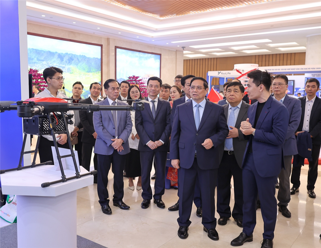 Thủ tướng và các đại biểu tham quan trưng bày các sản phẩm công nghệ tại Diễn đàn - Ảnh: VGP/Nhật Bắc