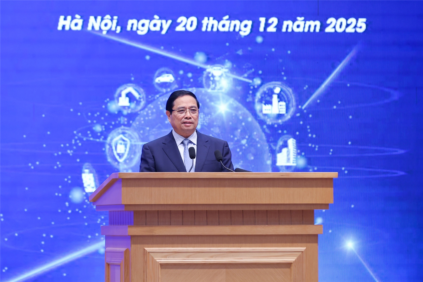 Phân tích bối cảnh, tình hình và các mục tiêu thời gian tới, Thủ tướng cho biết Đảng, Nhà nước đã xác định 2 mục tiêu chiến lược 100 năm, tăng trưởng kinh tế 2 con số những năm tới. Do đó, phải quán triệt quan điểm "Đảng lãnh đạo, Nhà nước kiến tạo, doanh nghiệp tiên phong, địa phương đi đầu, người dân hưởng ứng" trong xây dựng kinh tế số, xã hội số, công dân số; với tinh thần xã hội số là nền tảng, kinh tế số là động lực, người dân là trung tâm.