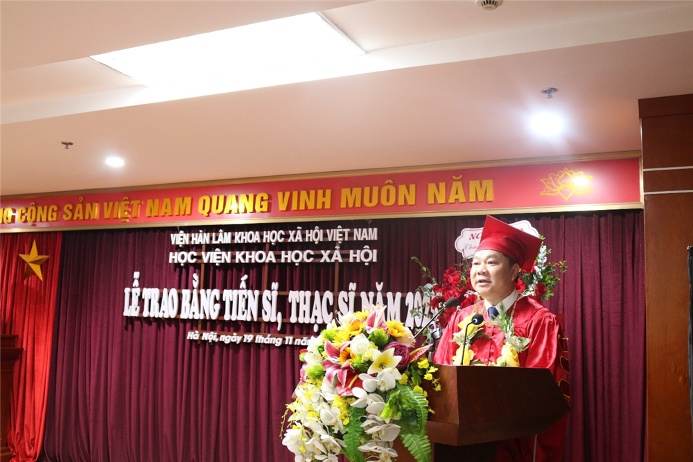 Phát biểu tại buổi lễ, PGS.TS. Nguyễn Huy Hoàng – Giám đốc Học viện chúc mừng các tân Tiến sĩ, Thạc sĩ đã nỗ lực vượt qua nhiều khó khăn để hoàn thành chương trình đào tạo. Đồng chí nhấn mạnh, trong bối cảnh đất nước chuyển mình mạnh mẽ, đẩy mạnh công nghiệp hóa, hiện đại hóa và hội nhập quốc tế sâu rộng, trách nhiệm của đội ngũ trí thức ngày càng lớn. Chính trong bối cảnh ấy, khoa học xã hội và nhân văn giữ vai trò đặc biệt quan trọng trong việc cung cấp nền tảng lý luận, luận cứ khoa học và cơ sở thực tiễn phục vụ hoạch định đường lối, chính sách phát triển của Đảng và Nhà nước. Việc học tập, nghiên cứu của các tân Tiến sĩ, Thạc sĩ sẽ đóng góp một phần quan trọng vào công cuộc chung đó.
