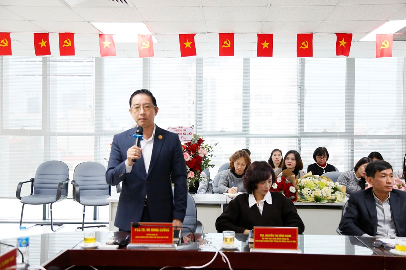 PGS.TS. Tạ Minh Tuấn - Phó Bí thư Đảng ủy, Phó Chủ tịch Viện Hàn lâmtặng hoa chúc mừng tân Phó Viện trưởng Viện Thông tin KHXH