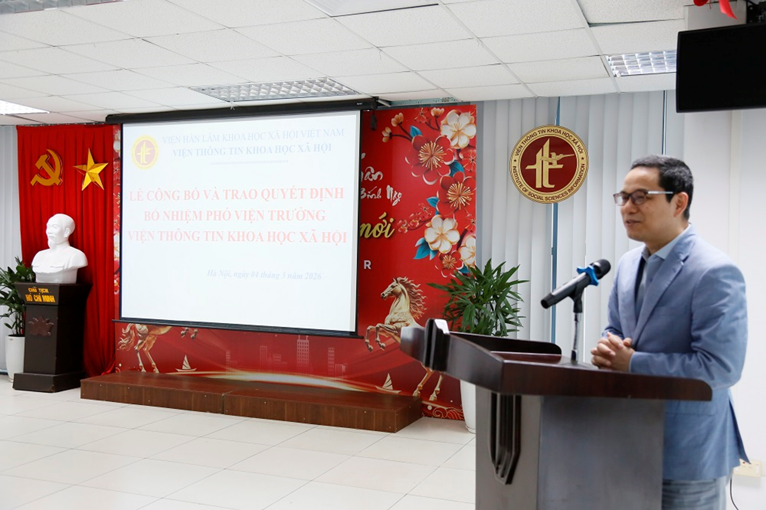 Tại buổi lễ, PGS.TS. Phạm Tất Thắng - Trưởng ban Ban Tổ chức - Cán bộ Viện Hàn lâm đã công bố Quyết định số 317/QĐ-KHXH ngày 03/03/2026 của Chủ tịch Viện Hàn lâm về việc điều động, bổ nhiệm PGS.TS. Nguyễn Duy Lợi - Phó Giám đốc Nhà xuất bản và Tạp chí KHXH giữ chức vụ Phó Viện trưởng Viện Thông tin KHXH. Thời hạn giữ chức vụ là 05 năm. Quyết định có hiệu lực kể từ ngày ký.
