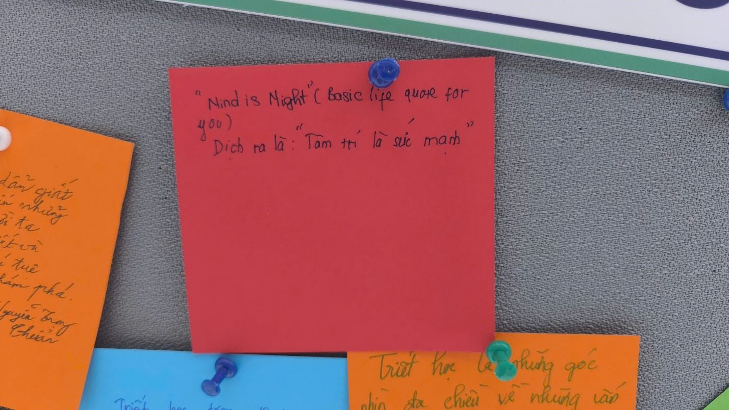 Đây là một không gian tương tác mở - nơi khách tham quan được tự do bày tỏ quan điểm cá nhân thông qua hai chủ đề chính: “Triết học trong tôi là...” và “Triết học trong thời đại AI là...”. Những tờ giấy ghi chú đầy màu sắc đan xen tạo nên một bức tranh tư duy phong phú, minh chứng cho sự kết nối giữa tri thức lý luận mang tính hàn lâm và đời sống thực tiễn sống động.