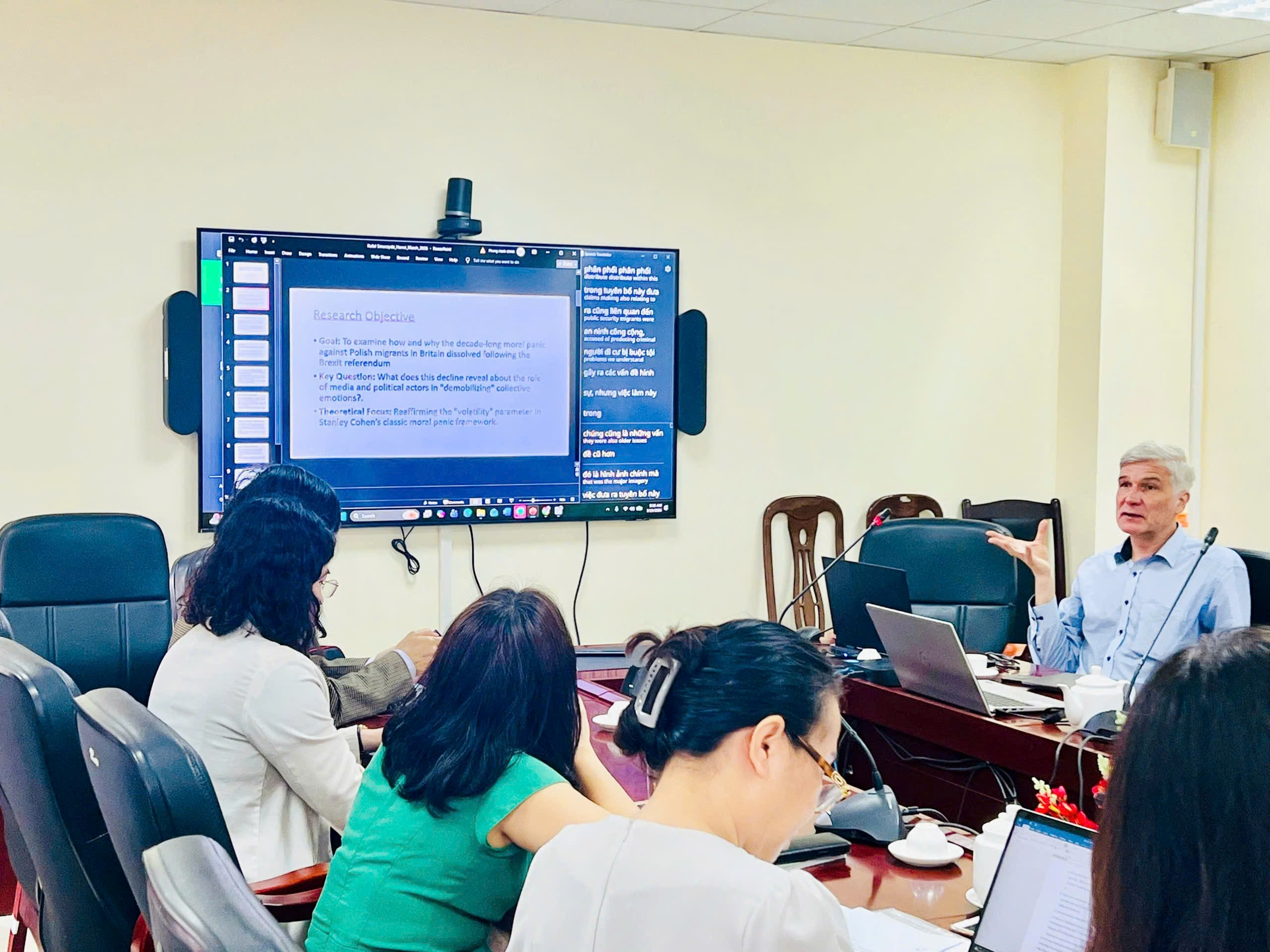 Tiếp nối chia sẻ từ đồng chí Viện trưởng và nguyên Viện trưởng của Viện, PGS.TS. Rafał Smoczyński bày tỏ sự cảm ơn và vui mừng khi có cơ hội được trở lại thăm viện và chia sẻ về kết quả nghiên cứu về lao động di cư. Bài trình bày đã tập trung vào sự suy giảm của “hoảng loạn đạo đức” (moral panic) đối với người Ba Lan tại Vương quốc Anh sau khi Vương quốc Liên hiệp Anh và Bắc Ireland rời khỏi Liên minh châu Âu (Brexit). Từ một nghịch lý mang tính lý thuyết, khi các điều kiện cấu trúc như bất ổn lao động không thay đổi đáng kể nhưng phản ứng xã hội lại giảm, nghiên cứu tái khẳng định vai trò của “tính biến động” trong mô hình của Stanley Cohen.