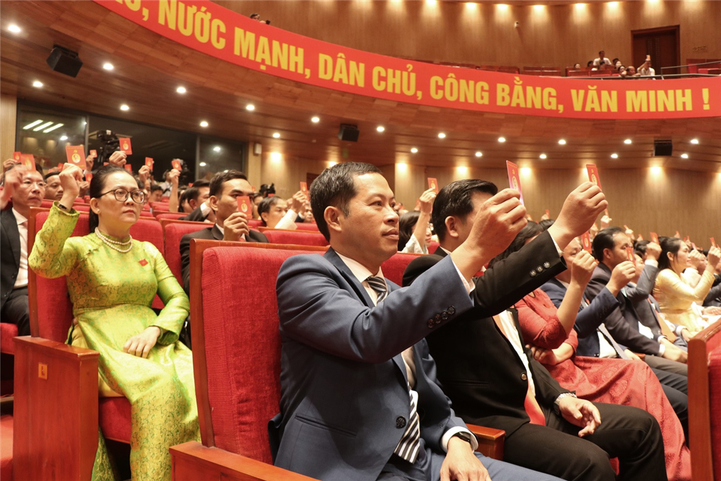 Đại biểu biểu quyết thông qua dự thảo Nghị quyết Đại hội Đảng bộ  thành phố Huế lần thứ XVII, nhiệm kỳ 2025 - 2030_Ảnh: TTXVN