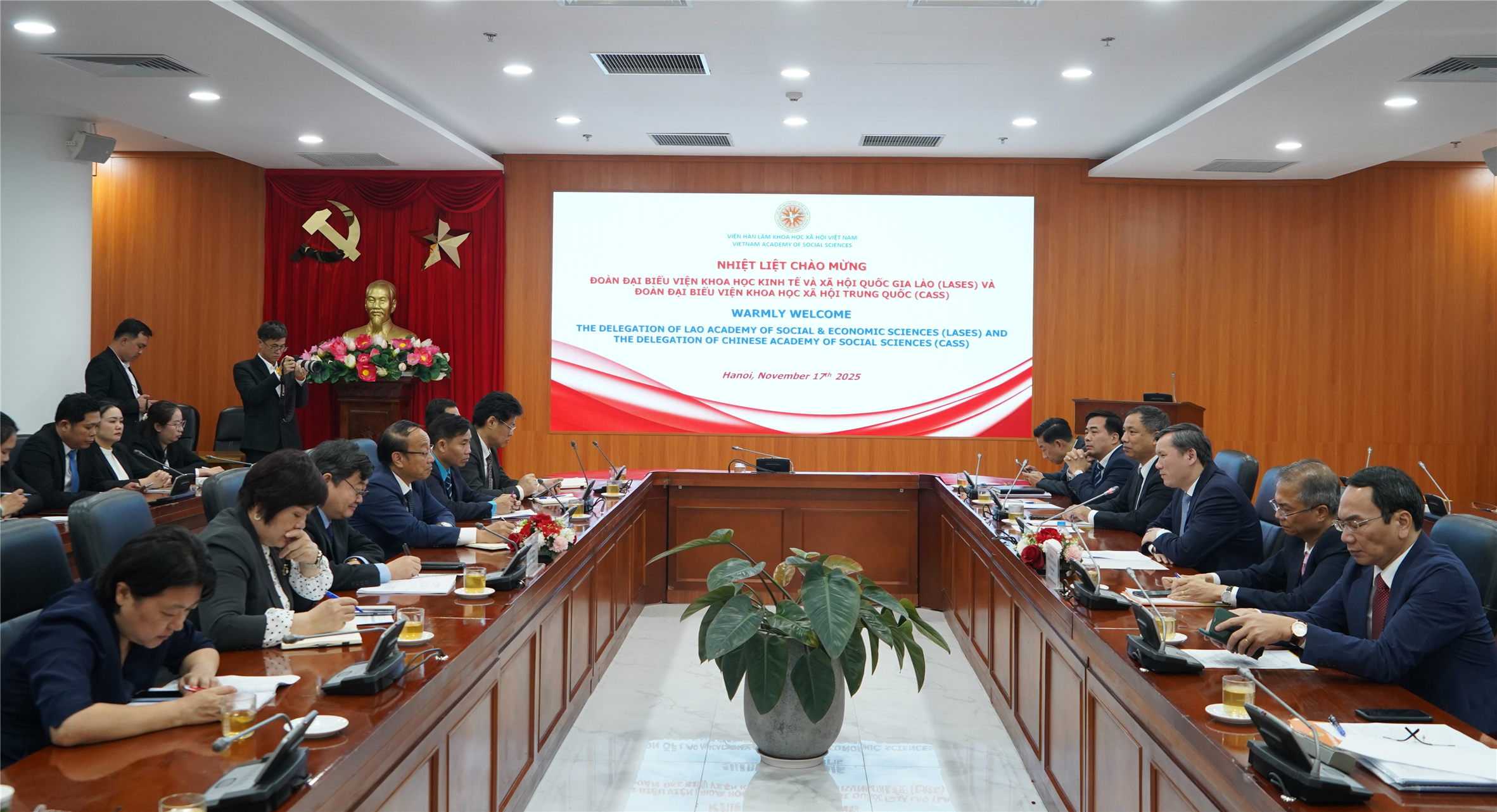 Ngay sau thành công của Diễn đàn quốc tế về chủ nghĩa xã hội lần thứ XII “Quản trị nhà nước xã hội chủ nghĩa trong bối cảnh thời đại mới”, chiều 17/11/2025, tại trụ sở Viện Hàn lâm Khoa học xã hội Việt Nam (Viện Hàn lâm – VASS), GS.TS. Lê Văn Lợi, Bí thư Đảng ủy, Chủ tịch Viện Hàn lâm, đã chủ trì buổi tiếp và làm việc với Đoàn Viện Khoa học Kinh tế và Xã hội Quốc gia Lào do Phó Chủ tịch Saysongkham Manodham dẫn đầu, và Đoàn Viện Khoa học Xã hội Trung Quốc do GS.TS. Luo Wendong, Bí thư Đảng ủy, Phó Viện trưởng Viện Nghiên cứu Chủ nghĩa Mác làm Trưởng đoàn. Cùng dự có Phó Chủ tịch Đặng Xuân Thanh và đại diện lãnh đạo các đơn vị thuộc, trực thuộc Viện Hàn lâm.