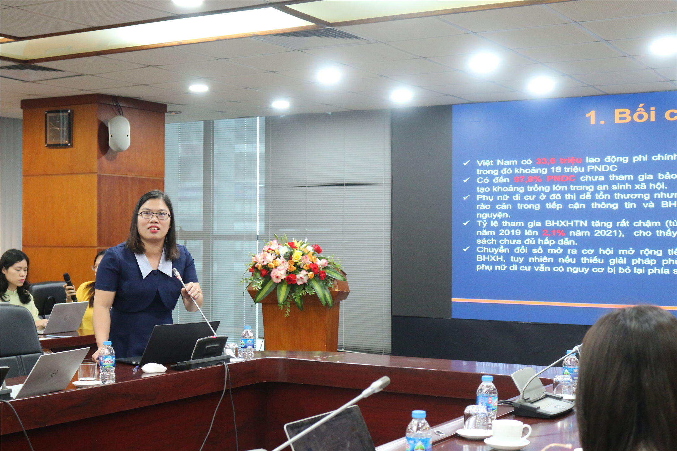 Các tham luận tập trung làm rõ nhiều vấn đề thực tiễn. TS. Nguyễn Thị Thanh Thủy phân tích những rào cản, khó khăn của phụ nữ di cư khi tiếp cận bảo hiểm xã hội tự nguyện trong bối cảnh chuyển đổi số và đề xuất giải pháp lồng ghép giới trong truyền thông cũng tối ưu hóa ứng dụng số để nâng cao tiếp cận.