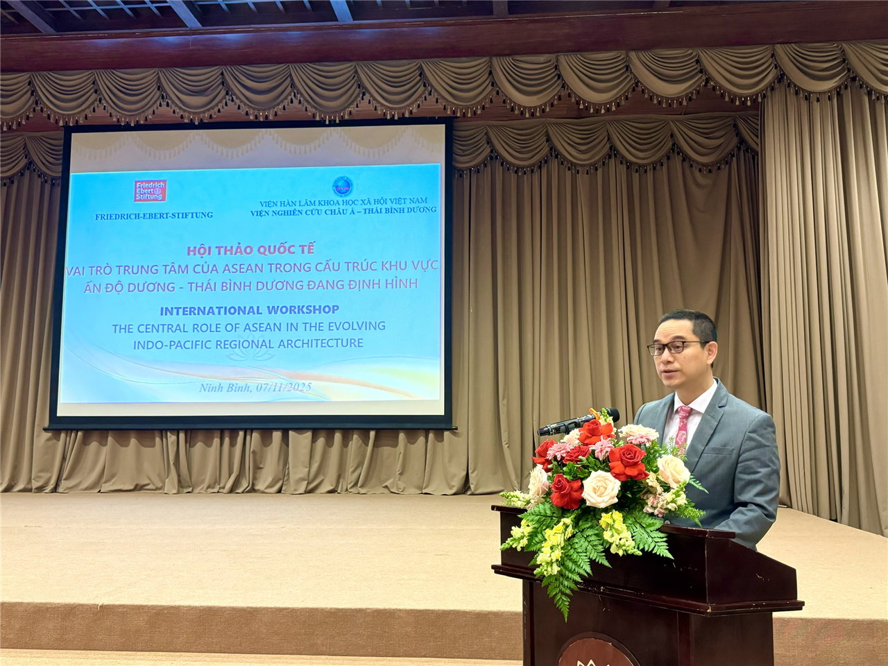 Phát biểu khai mạc hội thảo, PGS.TS. Tạ Minh Tuấn, Phó Chủ tịch Viện Hàn lâm khẳng định chủ đề về vai trò trung tâm của ASEAN mang tính thời sự sâu sắc trong bối cảnh khu vực Châu Á – Thái Bình Dương mở rộng sang không gian Ấn Độ Dương – Thái Bình Dương, đang chứng kiến những biến động địa chính trị đa chiều, phức tạp và cạnh tranh chiến lược giữa các nước lớn ngày càng gia tăng. Trong bối cảnh đó, việc củng cố vai trò trung tâm của ASEAN trở thành ưu tiên hàng đầu trong chính sách đối ngoại của Việt Nam, hướng tới một ASEAN hòa bình, ổn định, đoàn kết và thống nhất.