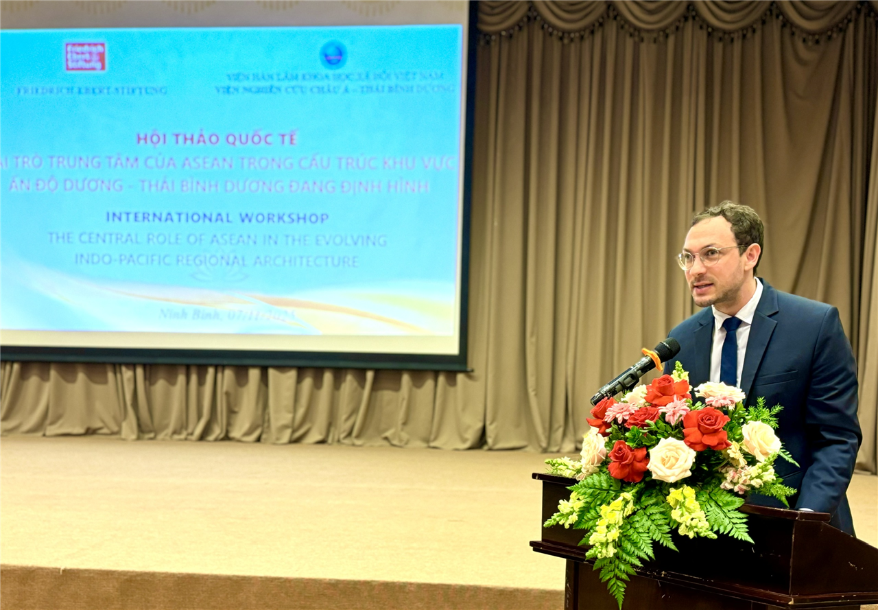 Phát biểu tại Hội thảo, ông Timo Rinke, Trưởng Đại diện Quỹ FES Việt Nam nhấn mạnh, hơn nửa thế kỷ qua, ASEAN đã khẳng định vai trò trung tâm trong cấu trúc an ninh và hợp tác khu vực, tạo dựng một nền tảng ổn định, đoàn kết và bao trùm – nơi các quốc gia, kể cả các cường quốc, có thể đối thoại và hợp tác ngay cả trong bối cảnh cạnh tranh chiến lược. Đức và Liên minh châu Âu coi ASEAN là đối tác chiến lược quan trọng, và việc FES đồng hành cùng Viện Hàn lâm tổ chức Hội thảo lần này thể hiện cam kết chung trong nghiên cứu, đối thoại học thuật và thúc đẩy phát triển bền vững khu vực.