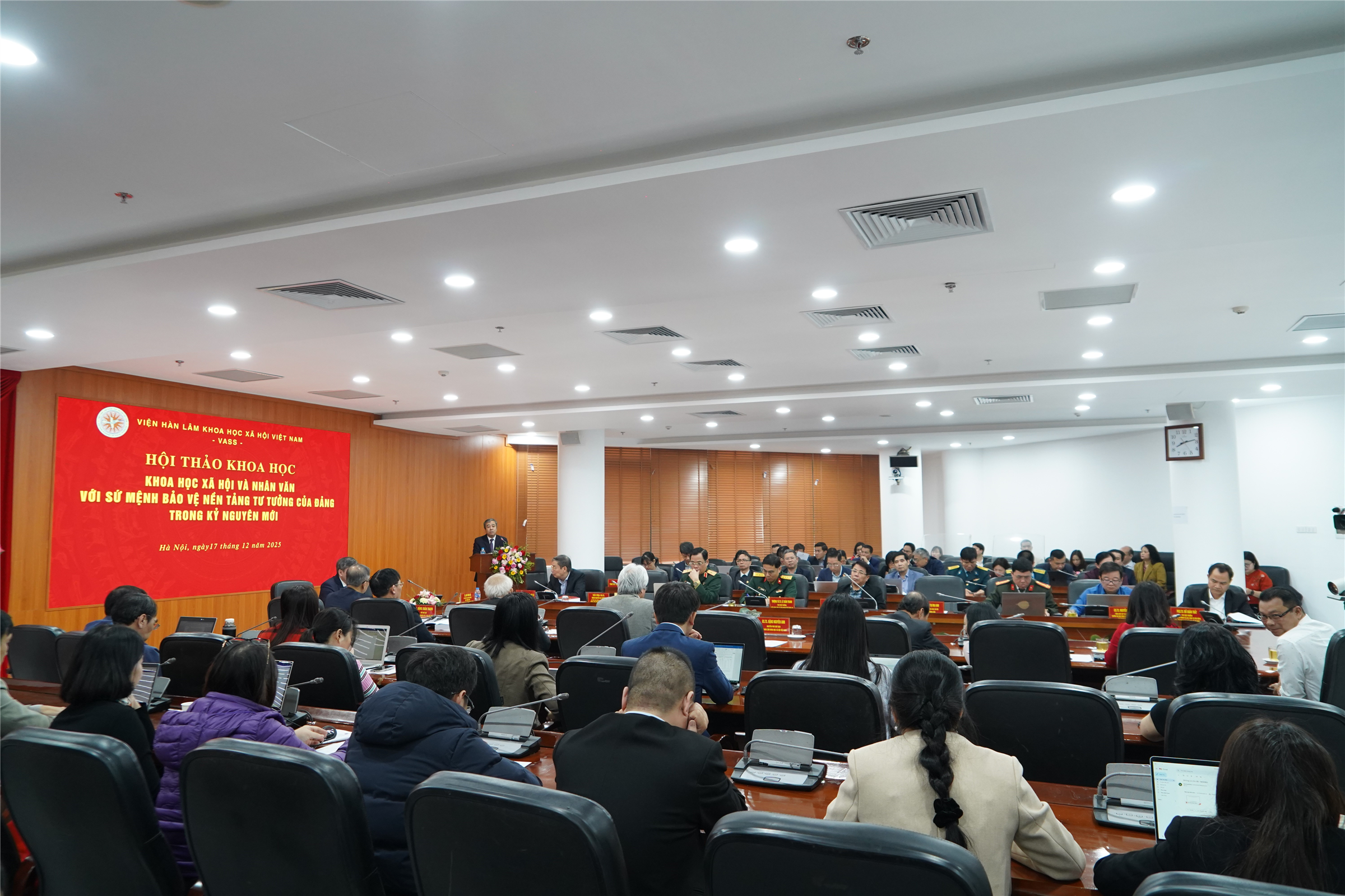 Hội thảo được tổ chức với hai phiên làm việc chính. Phiên thứ nhất tập trung làm rõ sứ mệnh của các ngành KHXH&NV trong bảo vệ nền tảng tư tưởng của Đảng do các diễn giả: PGS.TS. Đỗ Xuân Tuất, Phó Viện trưởng Viện Hồ Chí Minh và các lãnh tụ của Đảng, Học viện Chính trị Quốc gia Hồ Chí Minh; Thiếu tướng. PGS.TS.NGND. Nguyễn Bá Dương, Uỷ viên Hội đồng Lý luận Trung ương, Phụ trách Nhóm Chuyên gia 35 Quân ủy Trung ương; TS. Phạm Thị Thúy Nga, Viện trưởng Viện Nhà nước và Pháp luật, VASS; PGS. TS. Nguyễn Văn Minh, Viện trưởng Viện Dân tộc học và Tôn giáo học,VASS trình bày. Các tham luận tiếp cận vấn đề từ nhiều góc độ chuyên ngành như Hồ Chí Minh học, tư tưởng nhân văn quân sự, luật học và dân tộc học, qua đó khẳng định giá trị bền vững của tư tưởng Hồ Chí Minh; vai trò của tư tưởng nhân văn quân sự Việt Nam trong xây dựng nền quốc phòng toàn dân; cũng như ý nghĩa của khoa học pháp lý và nghiên cứu dân tộc học trong củng cố niềm tin xã hội, giữ vững ổn định chính trị – xã hội trong kỷ nguyên mới.