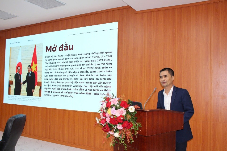 Báo cáo thứ nhất “Quan hệ Việt Nam – Nhật Bản trong lĩnh vực chính trị - ngoại giao giai đoạn 2020 – 2025: Thực trạng, thành tựu và triển vọng” do TS. Trần Hoàng Long trình bày. Báo cáo đánh giá quan hệ chính trị – ngoại giao Việt Nam – Nhật Bản giai đoạn 2020–2025, nhấn mạnh các hợp tác song phương và đa phương giữa hai nước. Trong bối cảnh cạnh tranh chiến lược toàn cầu và các thách thức khu vực, quan hệ hợp tác giữa hai nước vẫn được duy trì ổn định, tin cậy và phát triển vượt bậc.