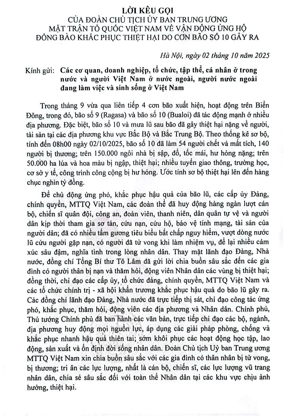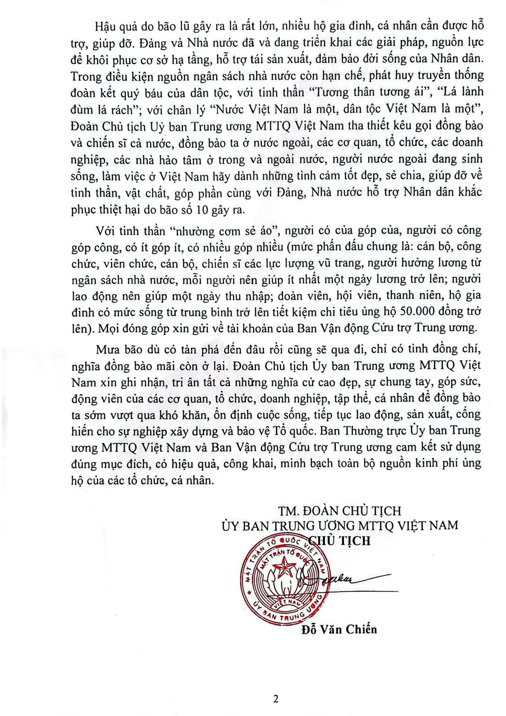 Chiều 2/10, Đoàn Chủ tịch Ủy ban Trung ương MTTQ Việt Nam tổ chức Lễ phát động ủng hộ đồng bào bị thiệt hại do cơn bão số 10 gây ra.