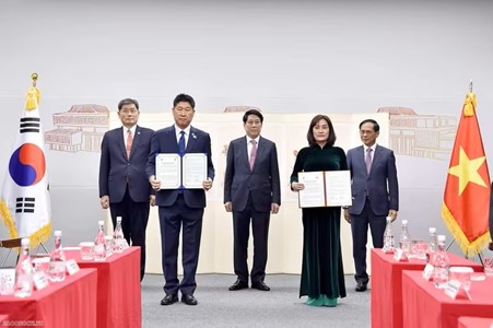 Bảo tàng Dân tộc học Việt Nam và Trung tâm Văn hóa ASEAN - KF trao MOU trước sự chứng kiến của Chủ tịch nước Lương Cường, Phó Thủ tướng Chính phủ Bùi Thanh Sơn và Chủ tịch Quỹ giao lưu Quốc tế Hàn Quốc (KF)
