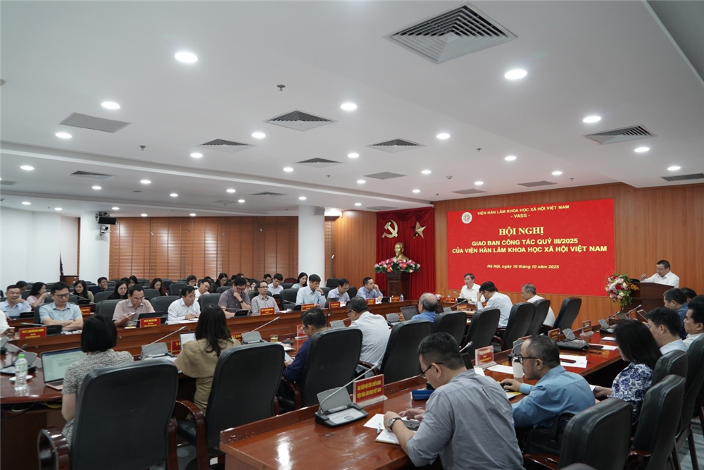 Với tinh thần đó, Hội nghị giao ban công tác Quý III và triển khai nhiệm vụ trọng tâm Quý IV năm 2025 của Viện Hàn lâm Khoa học xã hội Việt Nam được tổ chức sáng ngày 10/10/2025 tại trụ sở số 1 Liễu Giai, Hà Nội, dưới sự chủ trì của GS.TS. Lê Văn Lợi – Bí thư Đảng ủy, Chủ tịch Viện Hàn lâm KHXH Việt Nam, với sự tham dự của các Phó Chủ tịch Viện Hàn lâm; Lãnh đạo các đơn vị thuộc và trực thuộc Viện Hàn lâm; Chủ tịch Hội đồng Học viện Khoa học xã hội; Lãnh đạo Văn phòng Đảng ủy; Bí thư Đoàn TNCS HCM và Chủ tịch Hội Cựu Chiến binh Viện Hàn lâm.