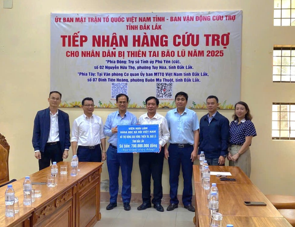 Tiếp nối tinh thần sẻ chia được lan tỏa mạnh mẽ từ Lễ phát động ủng hộ đồng bào vùng thiên tai tỉnh Đắk Lắk do GS.TS. Lê Văn Lợi, Bí thư Đảng ủy, Chủ tịch Viện Hàn lâm Khoa học xã hội Việt Nam (Viện Hàn lâm), chủ trì vào sáng 26/11/2025; Toàn thể viên chức và người lao động toàn Viện Hàn lâm đã thể hiện tinh thần tương thân tương ái, tích cực đóng góp chung tay sẻ chia với những mất mát to lớn với nhân dân tỉnh Đắk Lắk. Ngày 5/12/2025, Đoàn công tác của Viện Hàn lâm đã đến làm việc tại Ban Vận động cứu trợ tỉnh Đắk Lắk (Ủy ban Mặt trận Tổ quốc Việt Nam tỉnh), trao số tiền 700 triệu đồng ủng hộ đồng bào bị thiệt hại do mưa lũ.