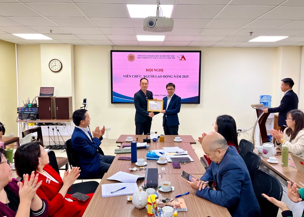 Tại Hội nghị, PGS.TS. Nguyễn Xuân Trung, Viện trưởng ISAWAAS, đại diện trình bày tóm tắt báo cáo về tình hình công tác của Viện trong năm 2025 và phương hướng, nhiệm vụ năm 2026. Bên cạnh đó, PGS.TS. Nguyễn Xuân Trung đã tuyên dương Phòng Nghiên cứu Trung Đông và Tây Á là tập thể phòng lao động xuất sắc, đồng thời đại diện viện Hàn lâm KHXH Việt Nam trao bằng khen của Chủ tịch Viện Hàn lâm KHXH Việt Nam.