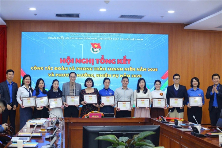 Kết thúc Hội nghị, Ban Thường vụ Đoàn Viện Hàn lâm đã công bố các quyết định khen thưởng và trao Giấy khen cho các tập thể, cá nhân có thành tích xuất sắc trong công tác Đoàn và phong trào thanh niên năm 2025, đồng thời ghi nhận, biểu dương những đóng góp nổi bật của các cá nhân tiêu biểu trong giai đoạn 2022–2025, góp phần lan tỏa tinh thần tiên phong, đoàn kết, sáng tạo và bứt phá của tuổi trẻ Viện Hàn lâm Khoa học xã hội Việt Nam./.