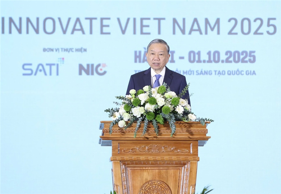 Tổng Bí thư Tô Lâm phát biểu chỉ đạo tại Lễ hưởng ứng Ngày hội Đổi mới sáng tạo quốc gia 2025 - Ảnh: VGP